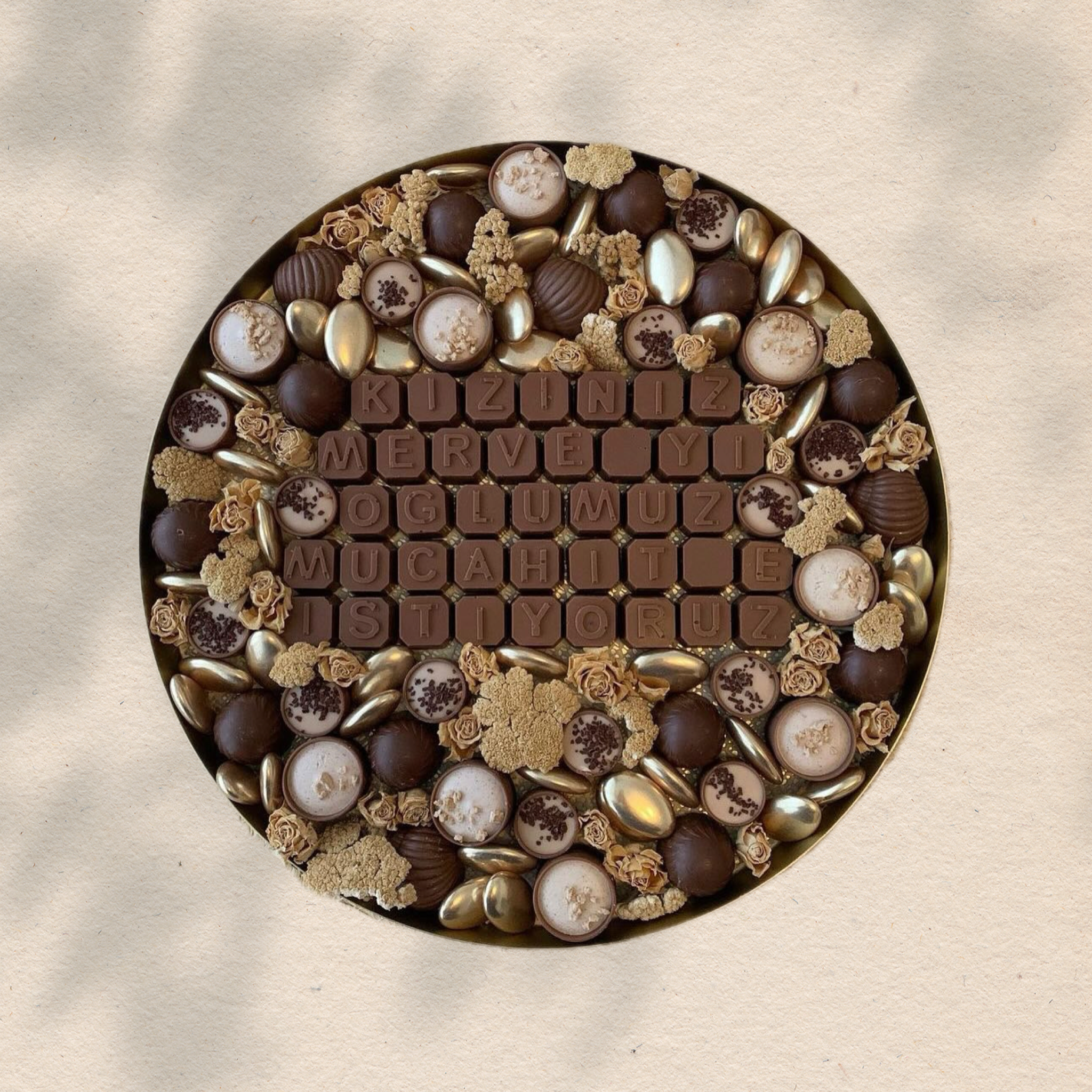 Vier jouw speciale gelegenheid met een exclusief chocolade arrangement als deze. Gecreëerd met ambachtelijke melk bonbons, Callebaut melk chocolade letterblokjes en dragees.